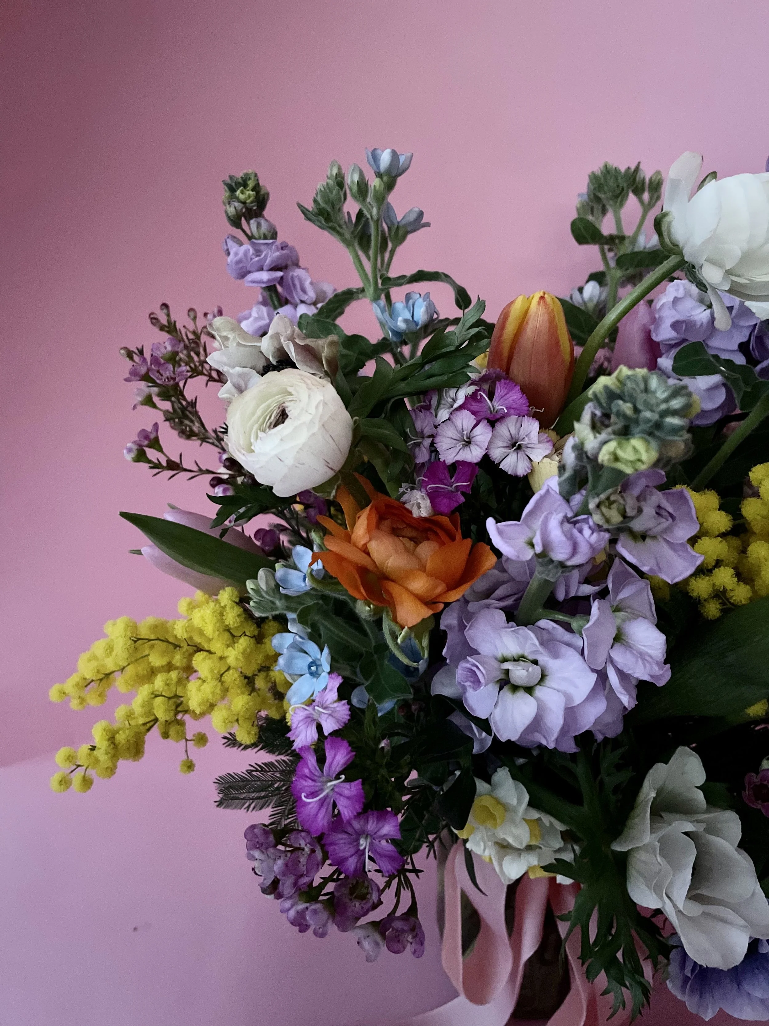 The most cheerful token of our appreciation to a lovely Mum. A love letter to Spring. An abundance of bright pastel colours, soft textures and layers of sweet fragrance with an array of seasonal flowers.
